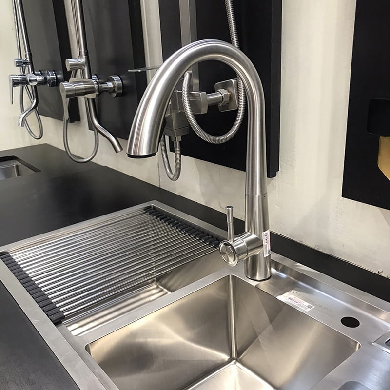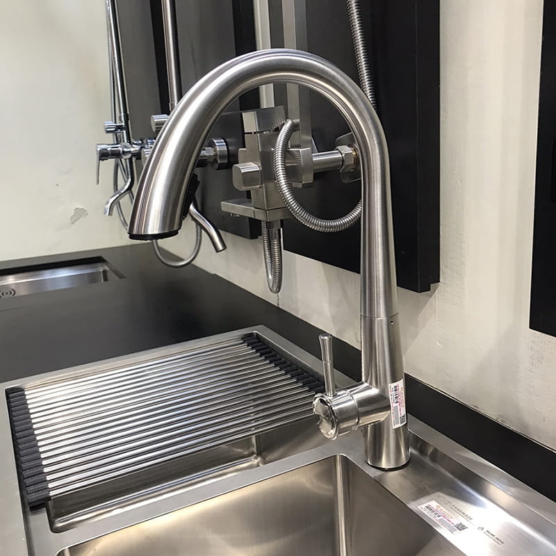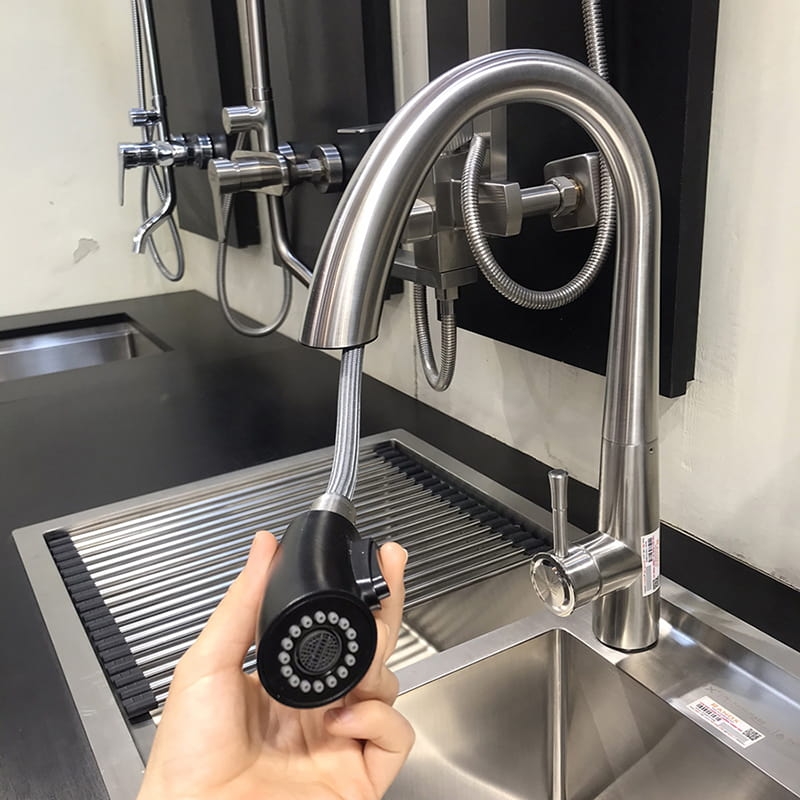- Vòi rửa chén 2 đường nước có chức năng kéo dây vệ sinh tới mọi vị trí trong bồn rửa.